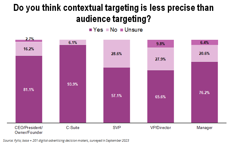 “The contextual solutions have evolved. We are seeing a lot of work on the publisher side to recreate first-party segments, and that’s going to work. But again, very siloed approaches,” he said. “We need to think more holistically and how we can recreate segments that are predictive enough. Using AI, using machine learning, without being able to completely replace that one-to-one addressability.”