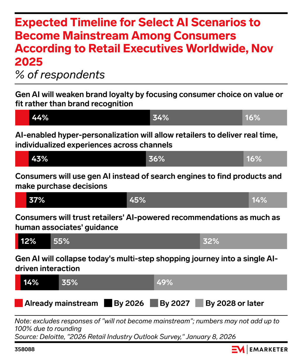 Aside from issues of trust, however, new research from Deloitte, cited by eMarketer, shows the majority of retail executives fearing generative AI will weaken brand loyalty.