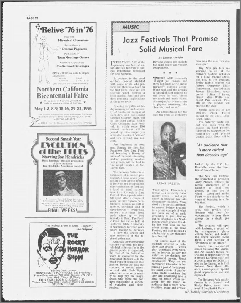An administrator for the past ten years at Berkeley’s Washington Elementary school, — a university “laboratory” school — and a pioneer in bringing jazz into elementary education, Wong cited a 15-year-old saxophonist named Rodney Franklin as a prime example of what can come out of an early grounding in jazz. Starting out on saxophone as a Washington second grader, Franklin last year son the top soloist award at the Reno Festival, and later received a scholarship at the Monterey Jazz Festival.
